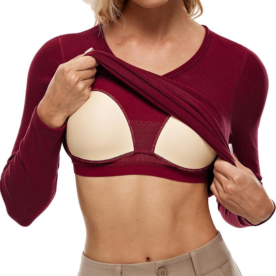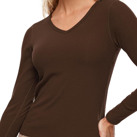 V Neck Ribbed Built In Bra Long Sleeve Tops
